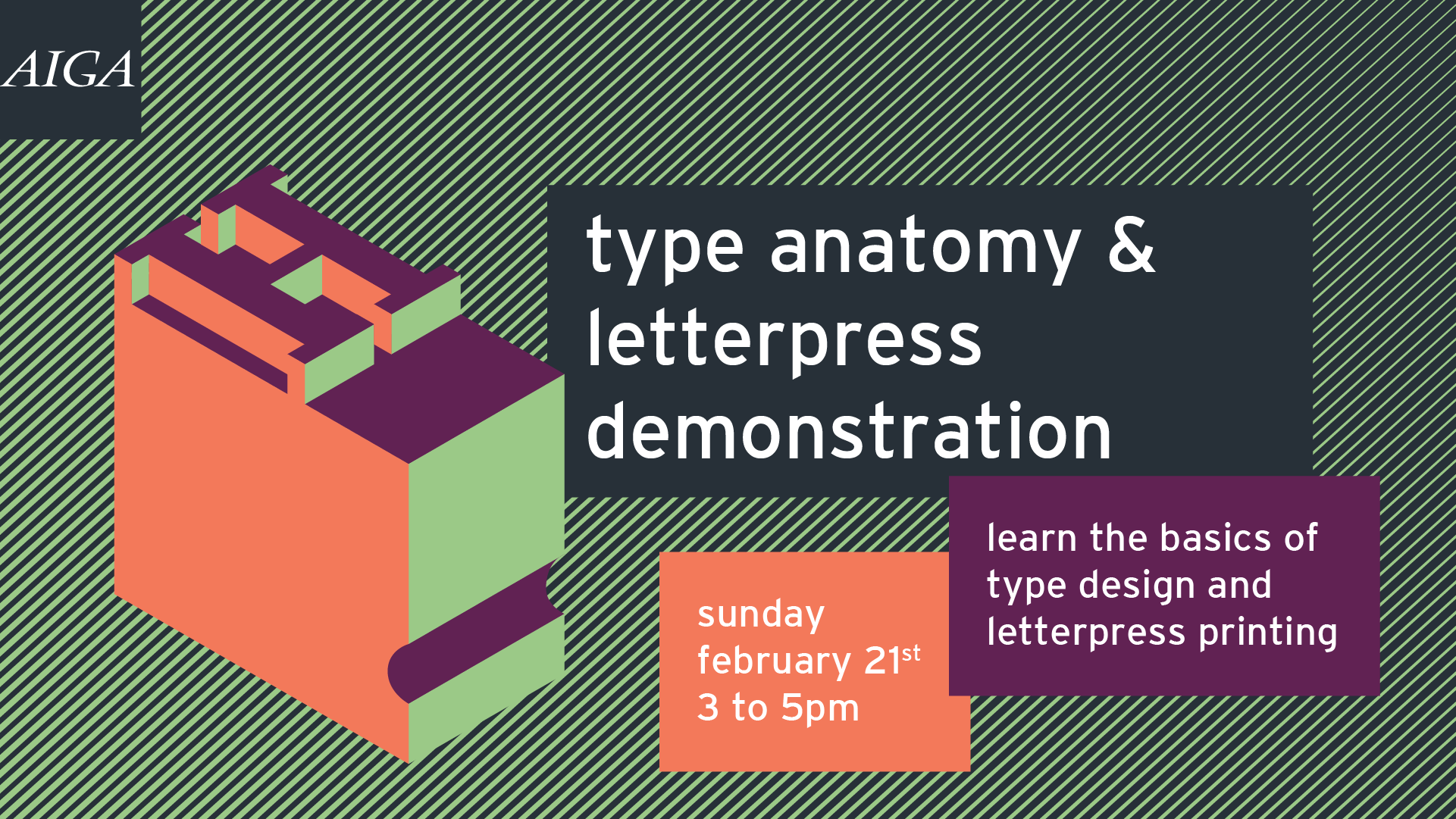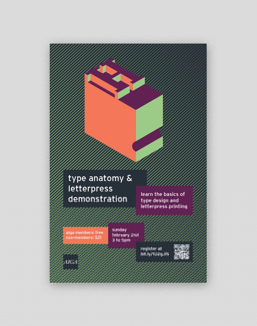 For our second event, a Type Anatomy & Letterpress Demonstration, we created a poster and web graphic to be distributed around town, online, and over email.
