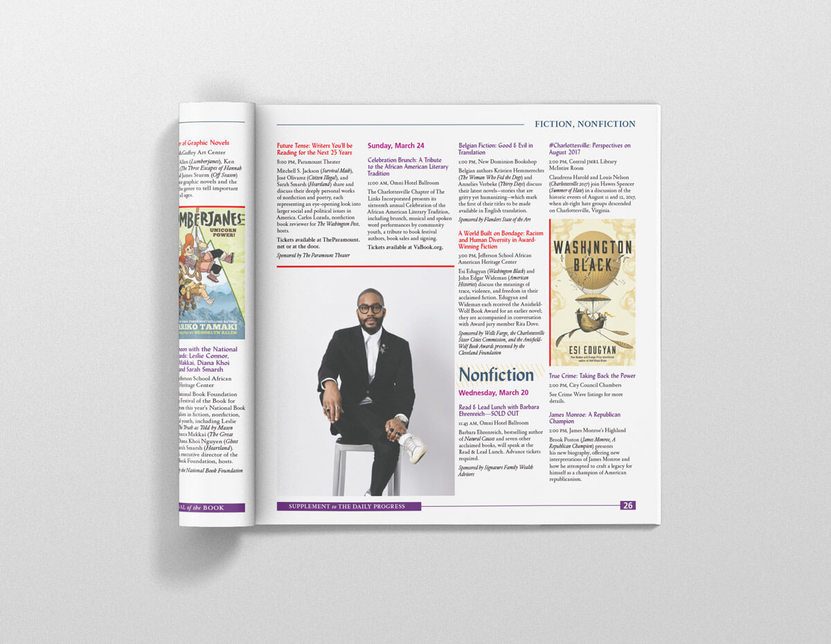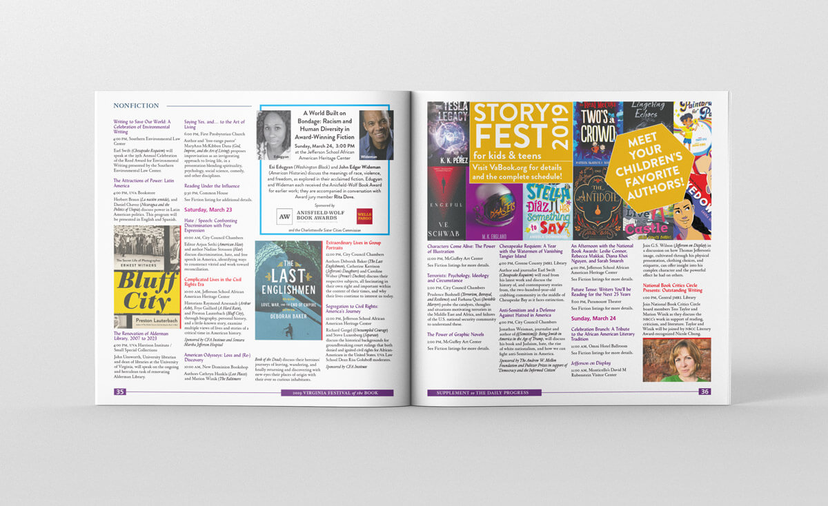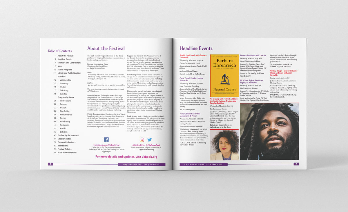Virginia Humanities, the organizing organization for the Virginia Festival of the Book, recently received a brand overhaul. As a result, the Festival of the Book’s program needed to look new, while maintaining a strong literary focus.