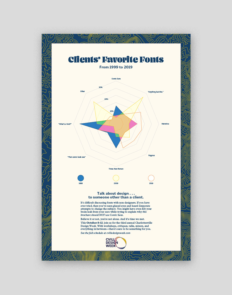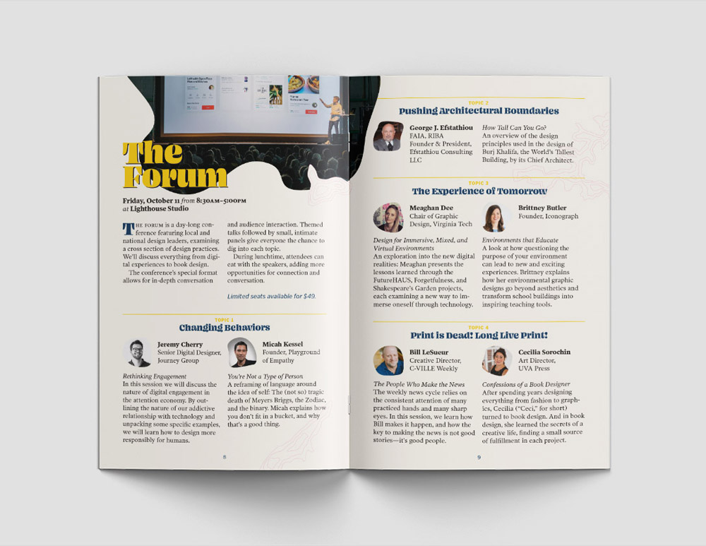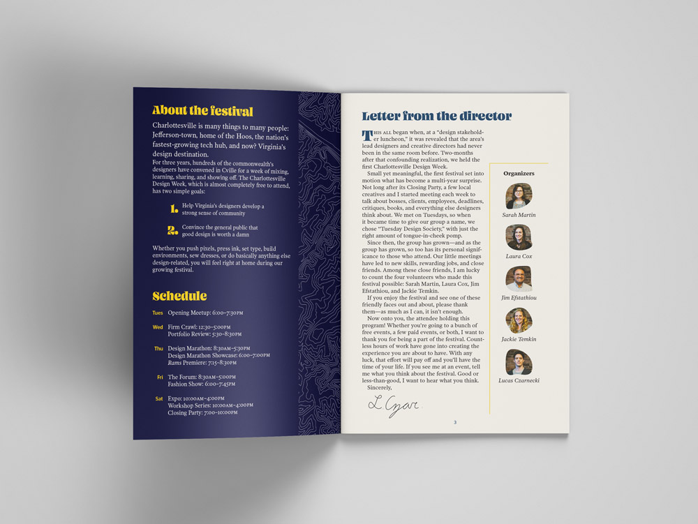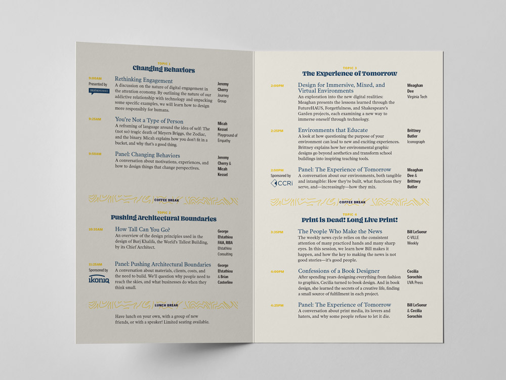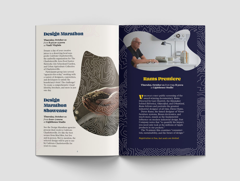 With more organizers, a lot of attention, and building momentum from the previous two years, the third annual Charlottesville Design Week needed new branding and collateral to carry it forward. It needed to remind visitors of previous years’ festivals while standing out as meaningfully better.