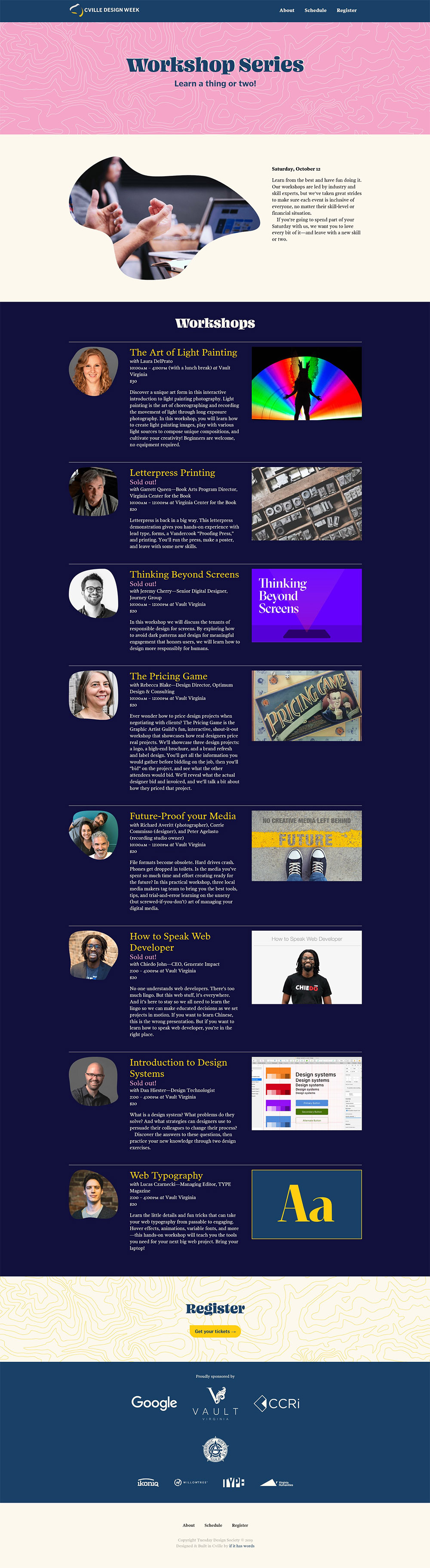 Charlottesville Design Week, Virginia’s first design festival, is a yearly gathering of creatives. Through a series of talks, critiques, tours, discussions and more, the festival aims to cultivate a sense of community and elevate the public perception of design.