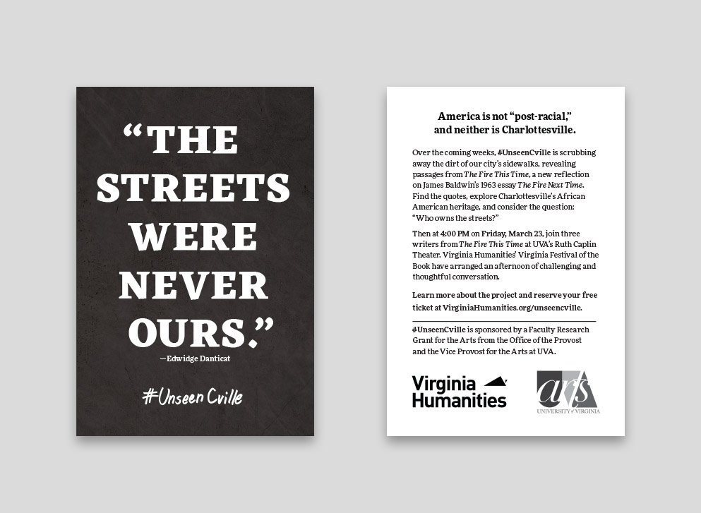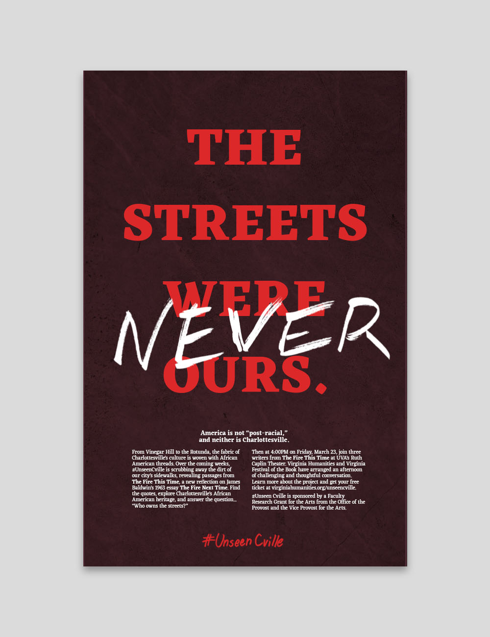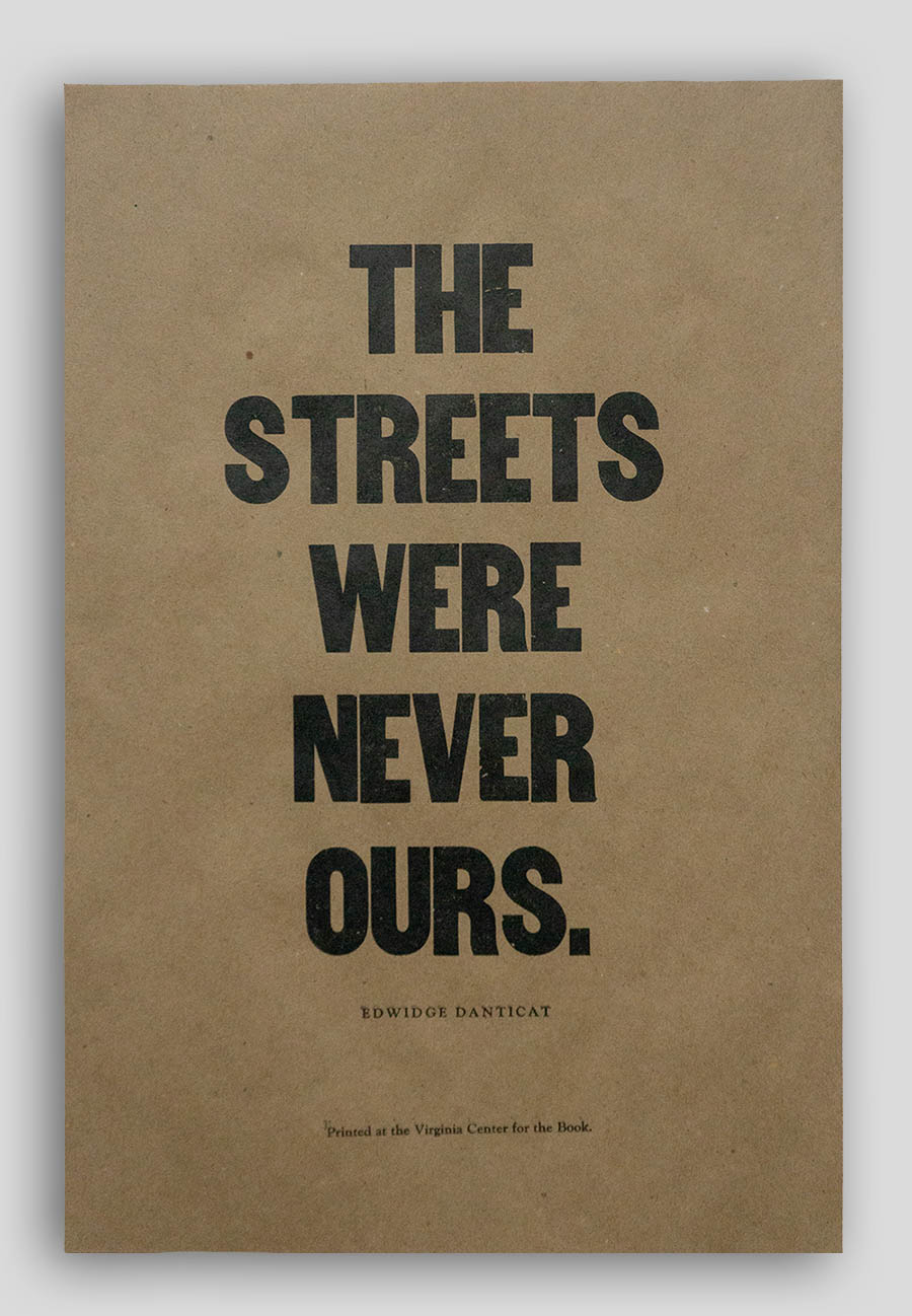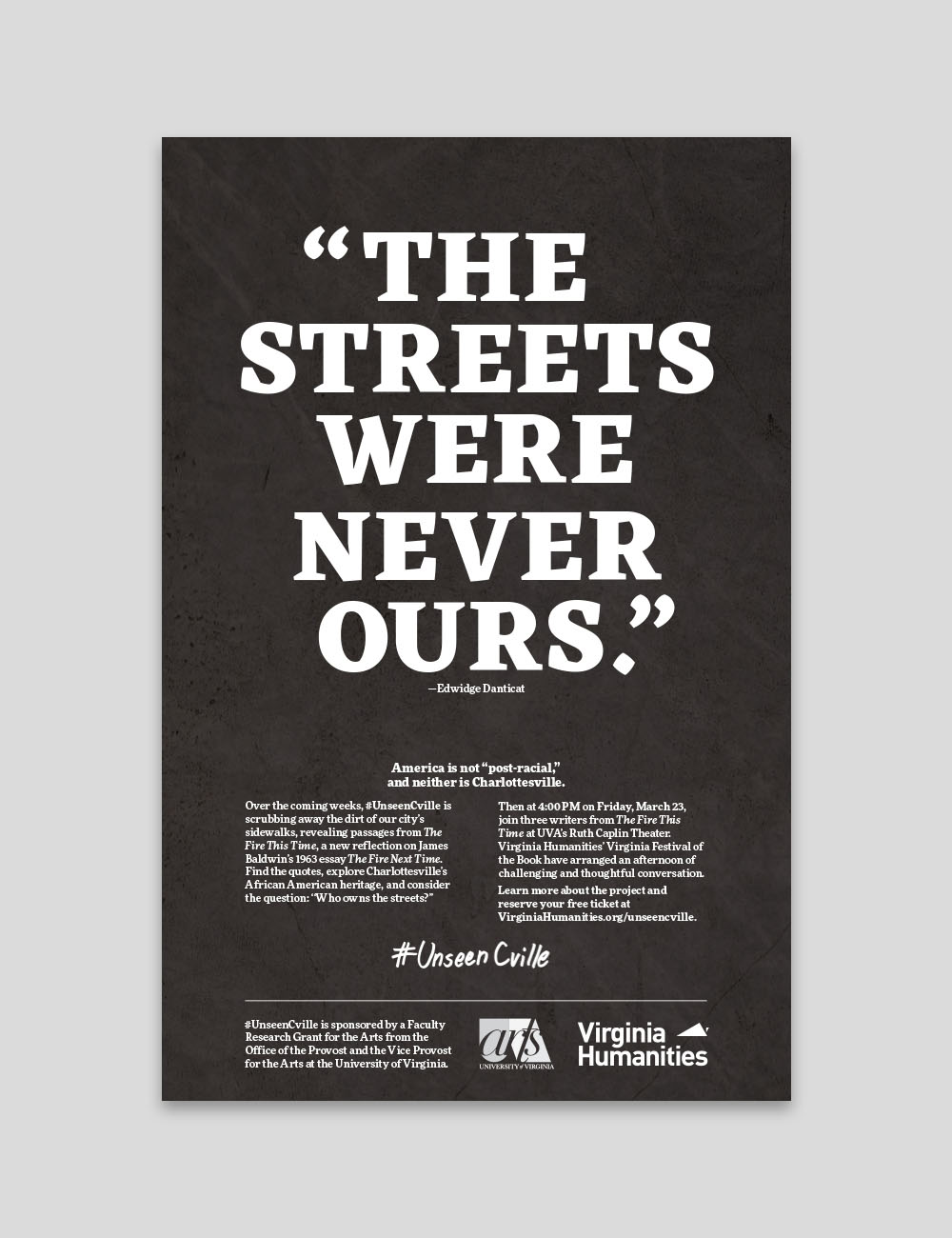 The University of Virginia and Virginia Humanities brought the authors of The Fire This Time, a reaction to Jame's Baldwin's The Fire Next Time to Charlottesville for the 2018 Festival of the Book. Leading up to their visit, they pressure-washed quotes from the book off the sidewalks around town, creating a large-scale, temporary art installation. I was asked to write and design flyers and posters about the project, advertising the Book Fest event. In addition, I made 80 letterpress prints from the authors to be handed out at the event. A set of these prints are now in the Schomburg Center for Research in Black Culture.