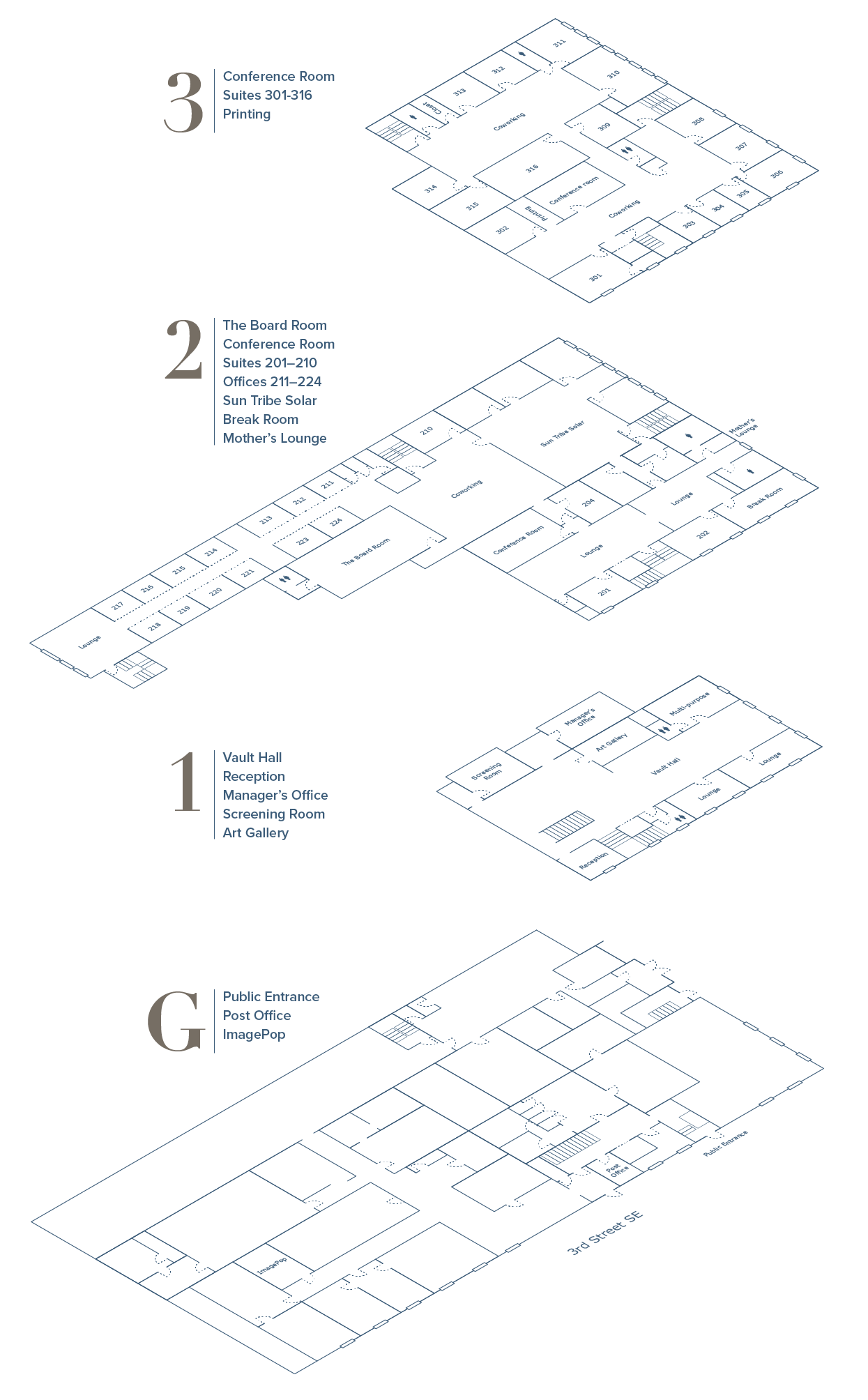 The work uses their brand colors and typefaces (Didot and Proxima Nova) to tell the space’s story. Since beginning work with them, all offices are filled. Now we’re working to fill the co-working spaces.