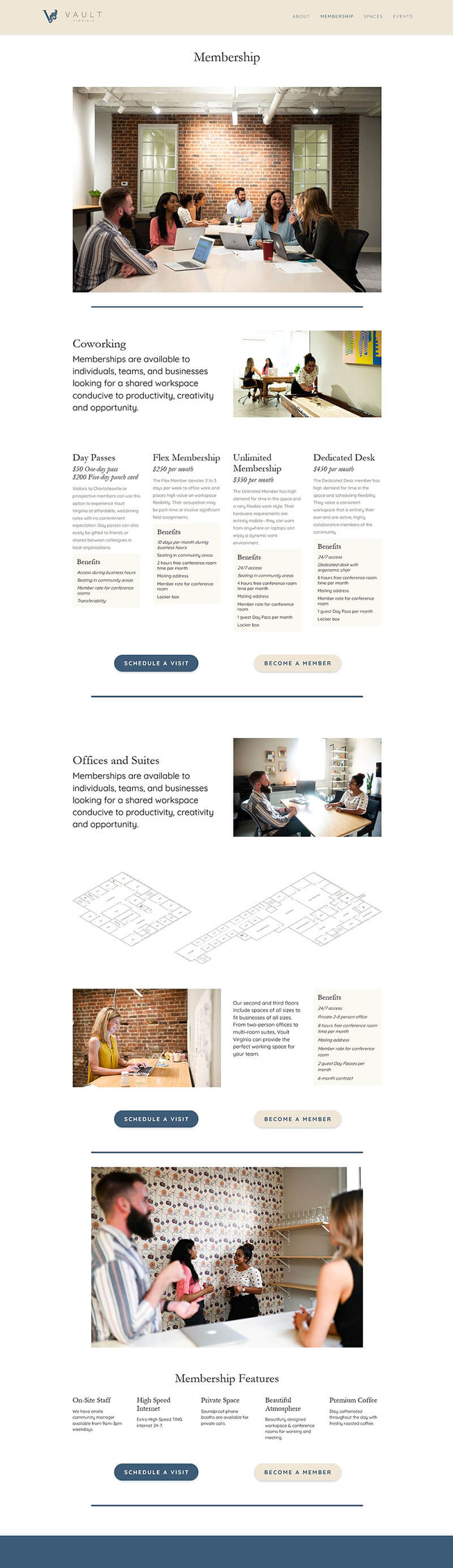 The work started with a new website. Leveraging the company’s existing brand colors and typefaces, I designed and developed conversion-centric home, membership, spaces, and about pages.