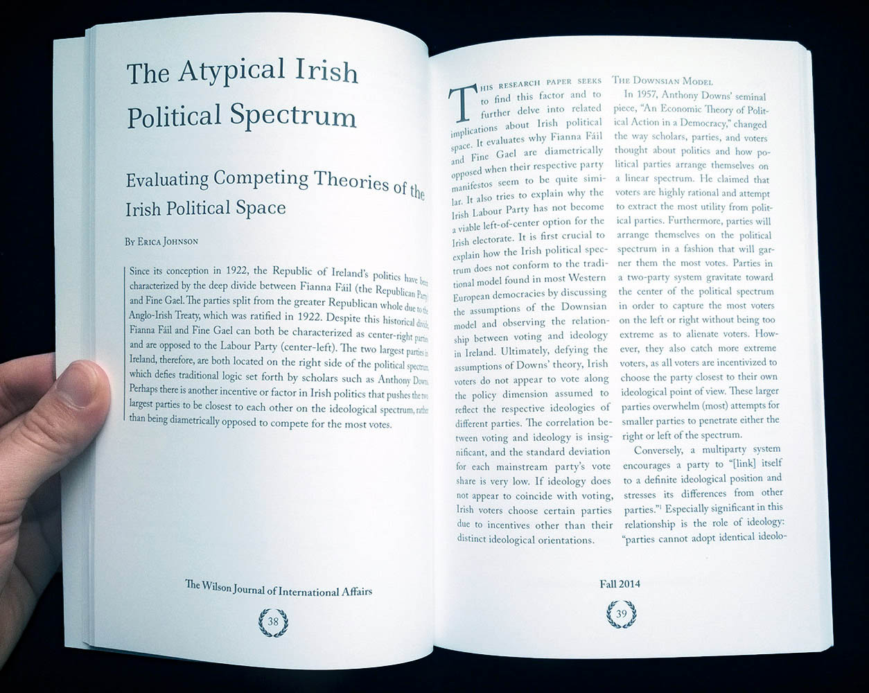 The Wilson Journal of International Affairs is a twice-annual research journal. If it has words redesigned the journal from the ground up, including a new logomark, logotype, cover design, and interior.
